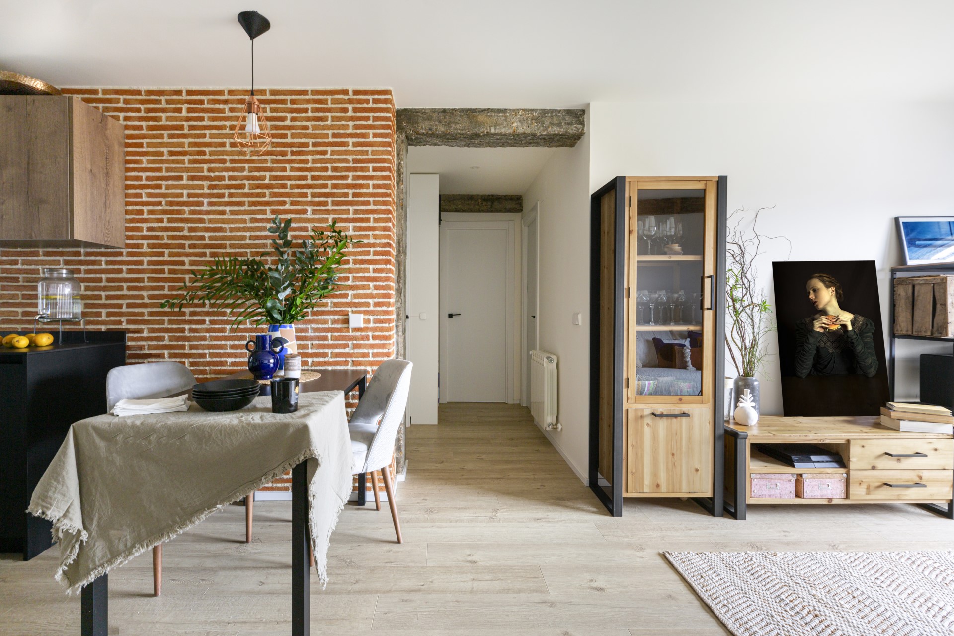 La Propiedad tiene claro su apuesta por el estilo industrial, por lo que nos embarcamos en una elección de materiales acorde a sus gustos. La madera, el ladrillo y el negro se usan como punto de partida en contraposición de una base neutra para dar amplitud y fomentar la luminosidad de la vivienda. De esta manera se utilizan los tonos oscuros en frentes localizados o en elementos seleccionados, como carpinterías, cerrajería o herrajes.