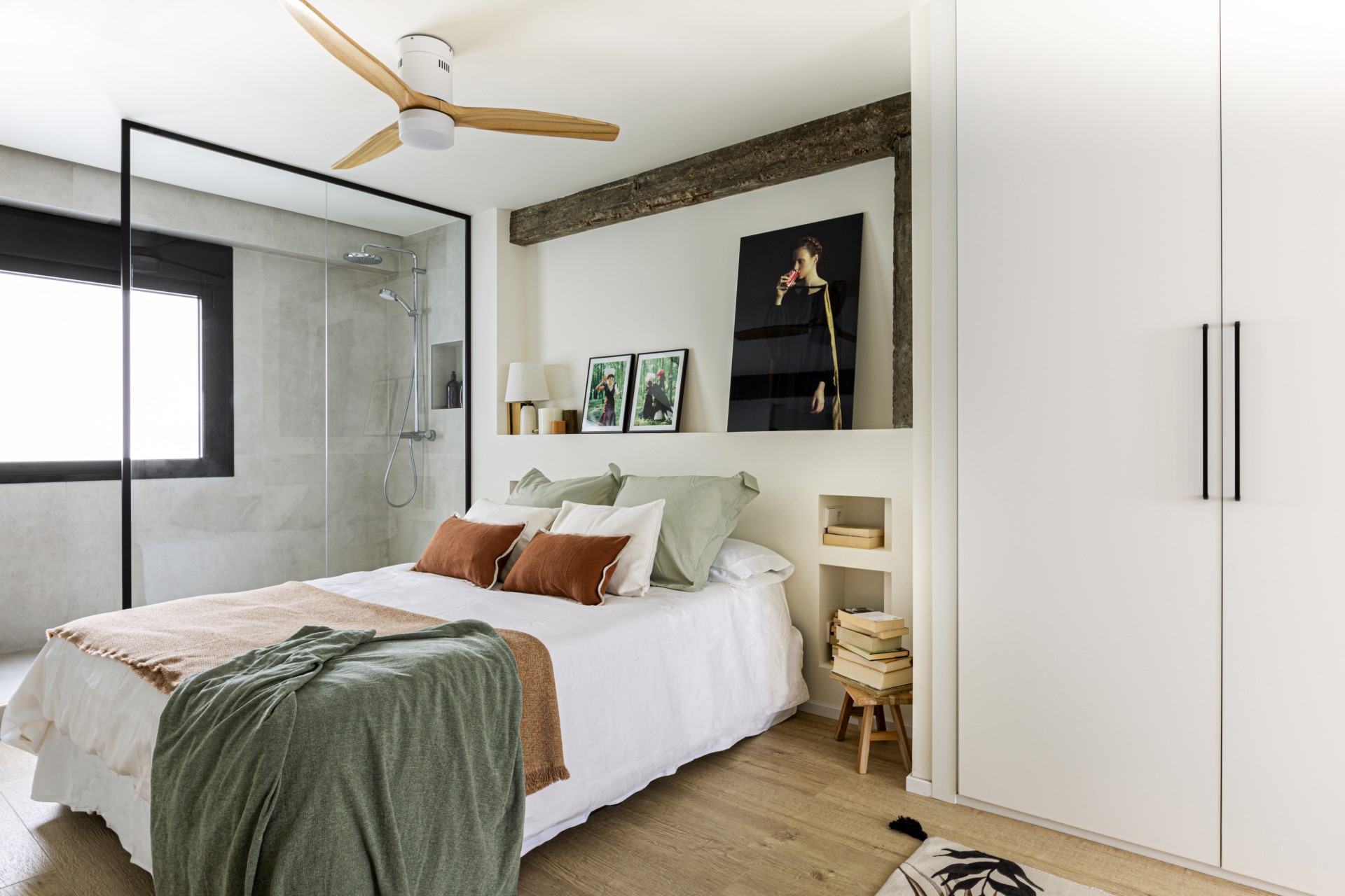 En la suite la fluidez se concibe integrando la ducha en el dormitorio y mediante una puerta de apertura doble permite cerrar el baño al completo o únicamente la zona más íntima del baño, y el vestidor se incorpora sin separación para aportar la luminosidad de la fachada principal. El cabecero y la carpintería se diseña a medida, favoreciendo las necesidades de almacenamiento.